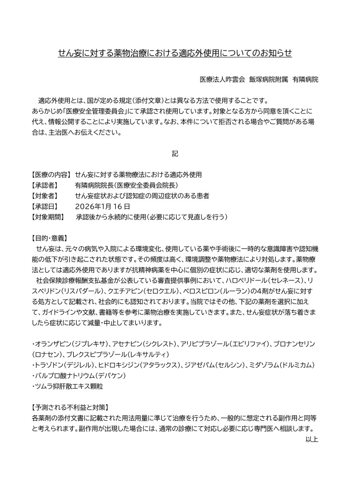 有隣病院におきまして、せん妄に対する薬物治療における適応外使用についてお知らせいたします。