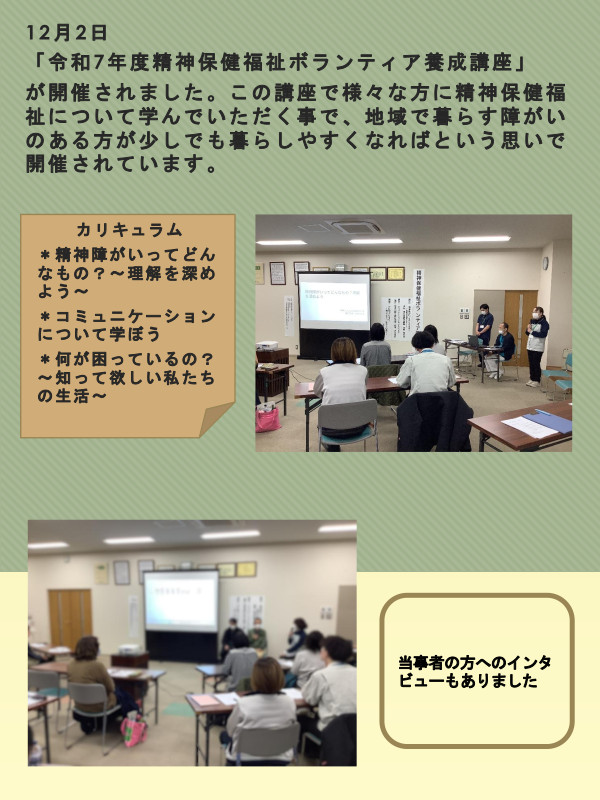 12月2日に開催された『令和7年度精神保健福祉ボランティア養成講座』の様子をお送りいたします。