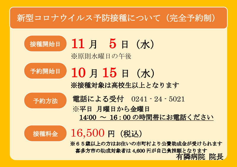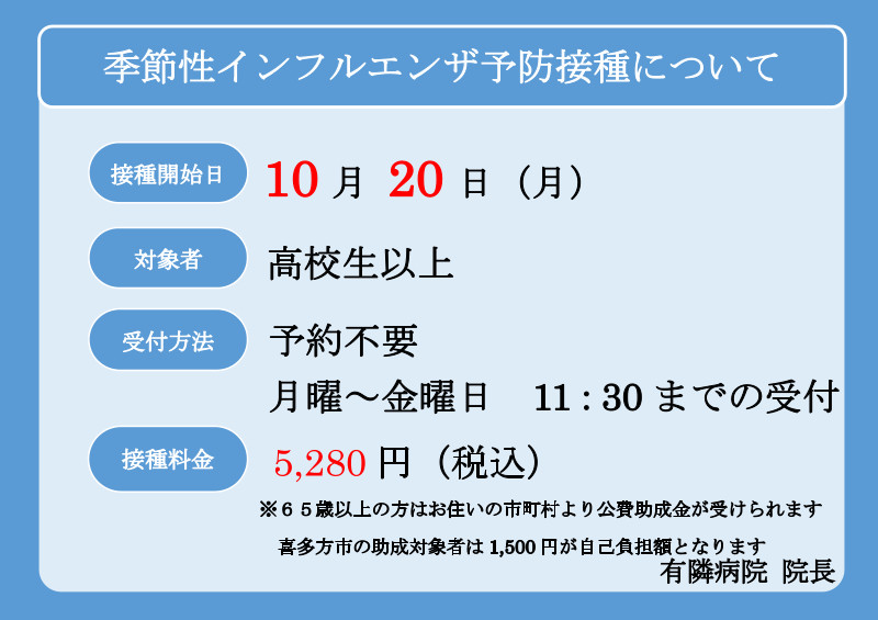 有隣病院におきまして、季節性インフルエンザ及び新型コロナウイルス予防接種の受付・料金についてお知らせいたします。